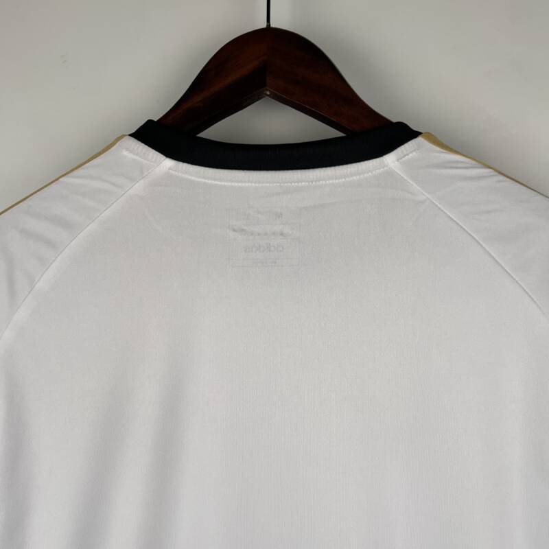 La camiseta tiene un color de contraste con dorado icónico de Le Coq Sportif y Luanvi. Tiene cuello redondo negro en lugar de pico, mangas de rejilla inspiradas en la marca Ad miTeam 2023.